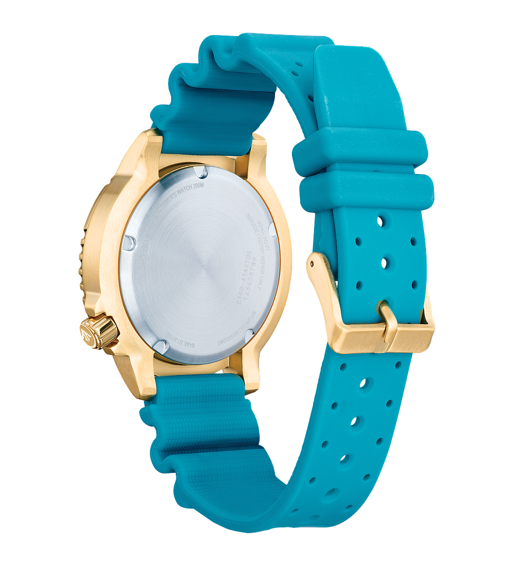 Explora las profundidades del océano con el Promaster Dive en este nuevo color lleno de estilo. Con detalles vibrantes como la caja de acero inoxidable dorada, bisel unidireccional con aro de aluminio, la carátula turquesa con fechador y 3 manecillas e indicadores luminosos, este reloj es una pieza esencial para bucear.